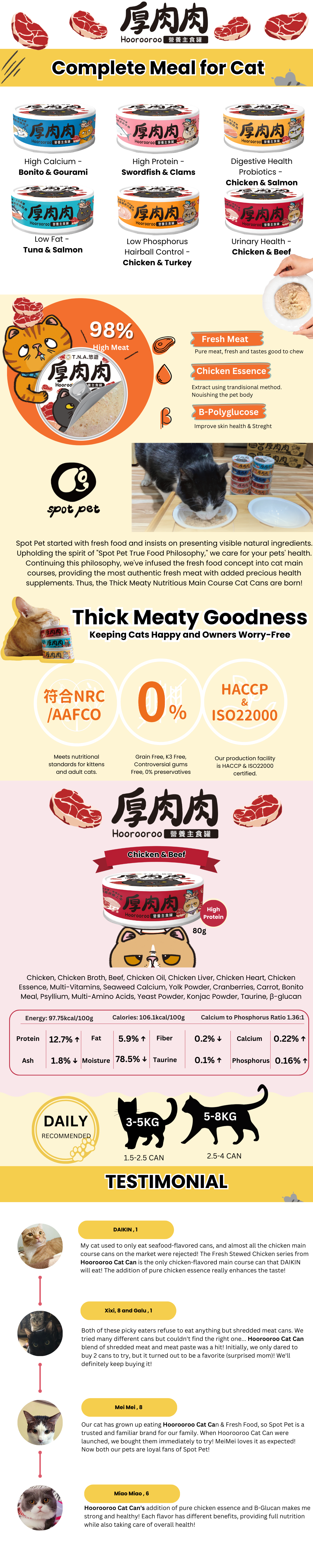 HOOROOROO started with fresh food, insisting on presenting visible natural ingredients, adhering to the spirit of 'Real Food' and taking care of the health of your furry children. We integrated the idea of fresh food into cats food, giving the most authentic fresh meat and adding precious health care products. Thick Meat Nutritious Staple Food Cat Can is here!!